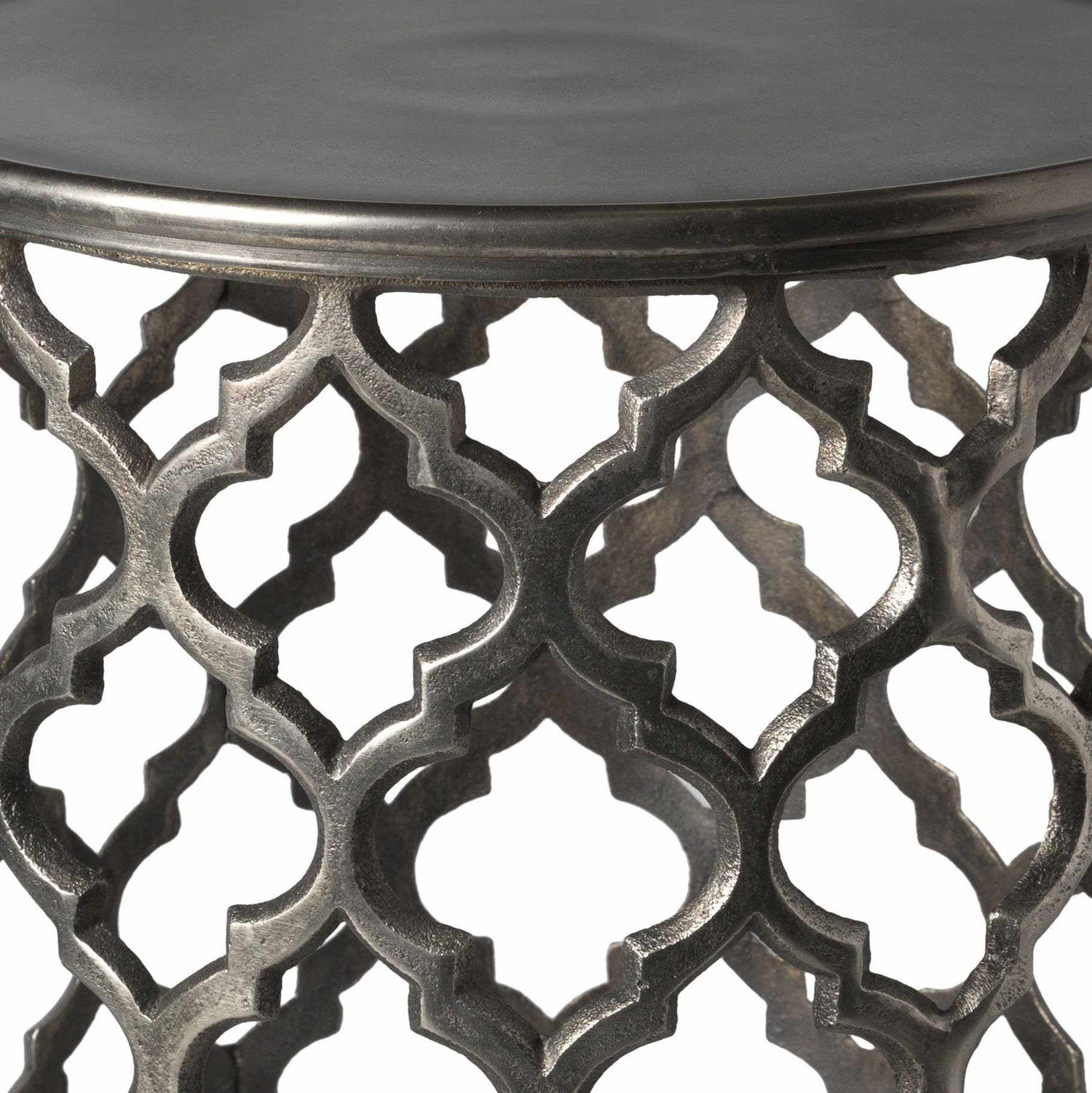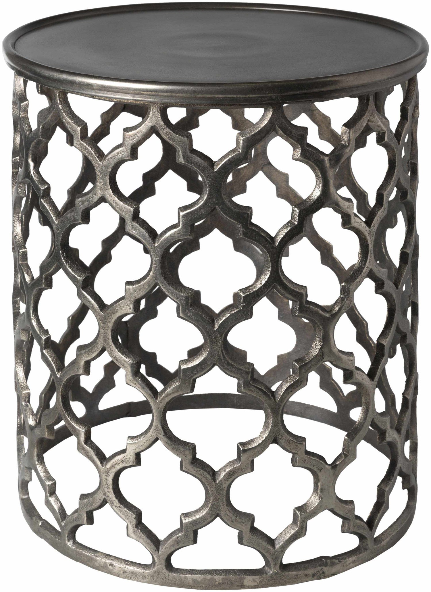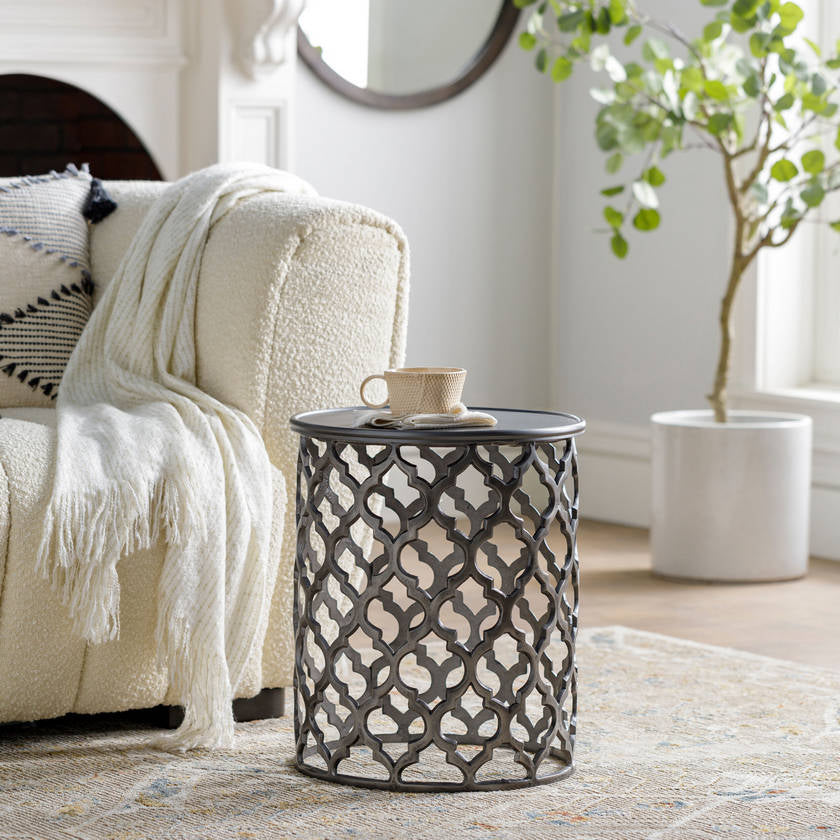 Add depth, texture, and understated elegance to your living space with the Pram Charcoal End Table, a versatile piece that bridges the gap between modern minimalism and timeless design. Handcrafted in India from durable metal, this end table features an intricate openwork lattice design finished in a rich charcoal tone, bringing both visual interest and functionality to your home.