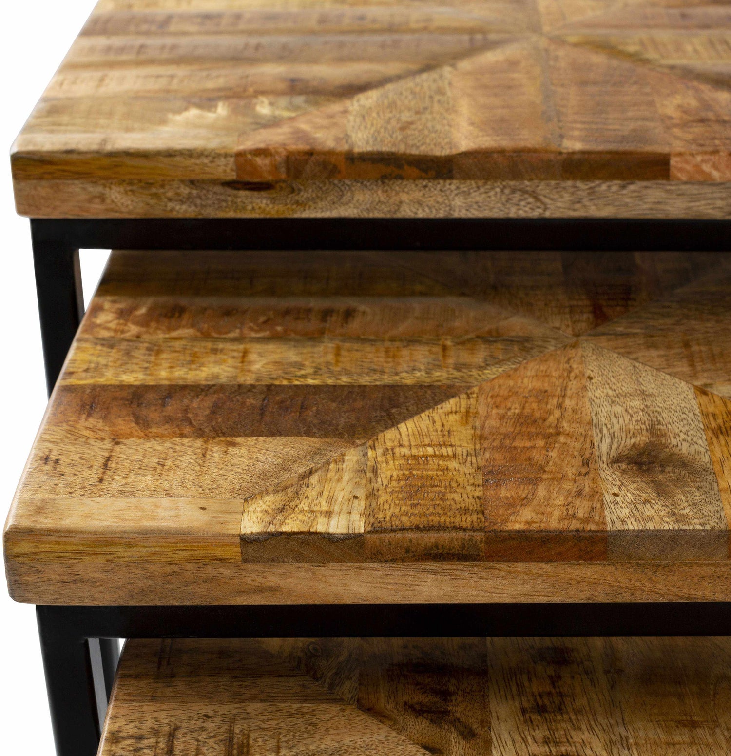Each table in the Schleedorf set is constructed with kiln-dried wood, ensuring resistance to cracking, warping, and wear over time. The smooth, polished wood surfaces feature subtle geometric grain patterns, offering warmth and depth to the design. Paired with a matte black metal base, the result is a classic-meets-industrial look that feels timeless in any setting. Whether used daily or brought out for special occasions, these nesting tables are made to last.