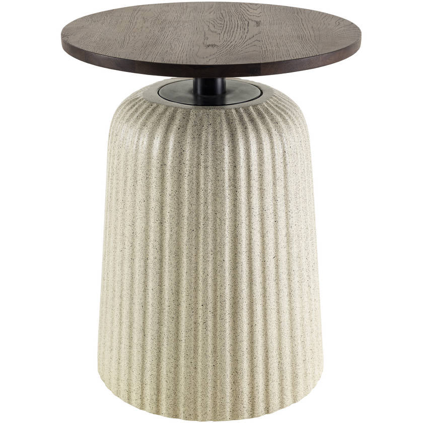 Introducing the Sherise End Table, a minimalist modern marvel that seamlessly blends functionality and style. This striking piece features a top made from refined wood veneer, providing an earthy yet polished aesthetic. The base is crafted from robust concrete and sturdy steel, offering stability that matches its visual allure. Manufactured in Vietnam, this end table brings a touch of exotic charm to your living space. And when it comes to maintenance, it's as easy as a quick wipe with a damp cloth and mild soap if required; ensuring that your Sherise End Table stays looking fresh and chic for years to come.