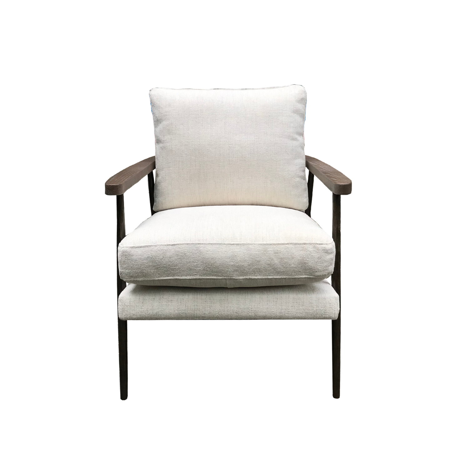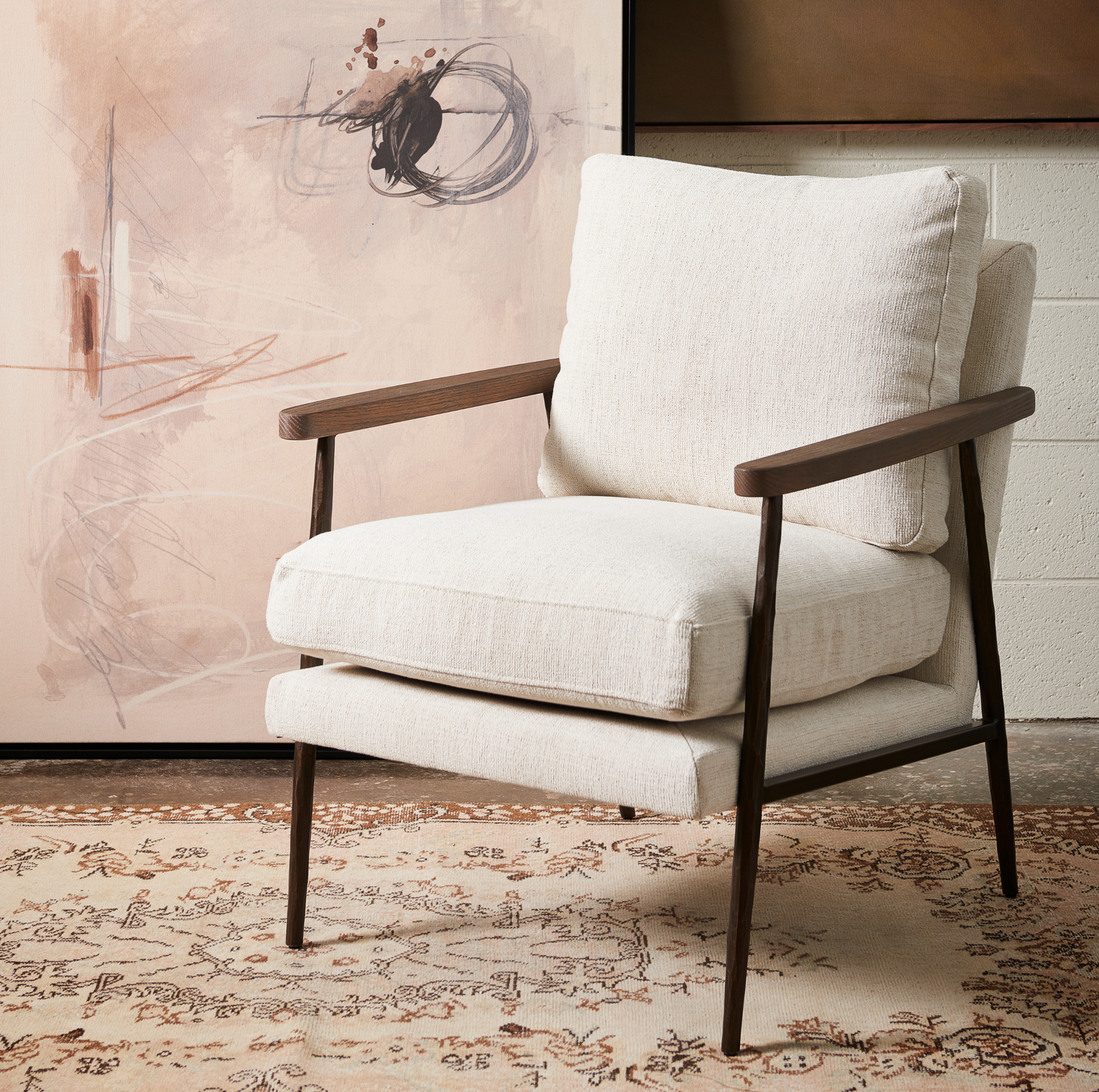 Elevate your space with the Steinbeck Chair - an accent chair that excludes sophistication. Wrapped in a textural white fabric, this chair seamlessly blends forged metal with solid oak wood arms for a contemporary yet timeless look.