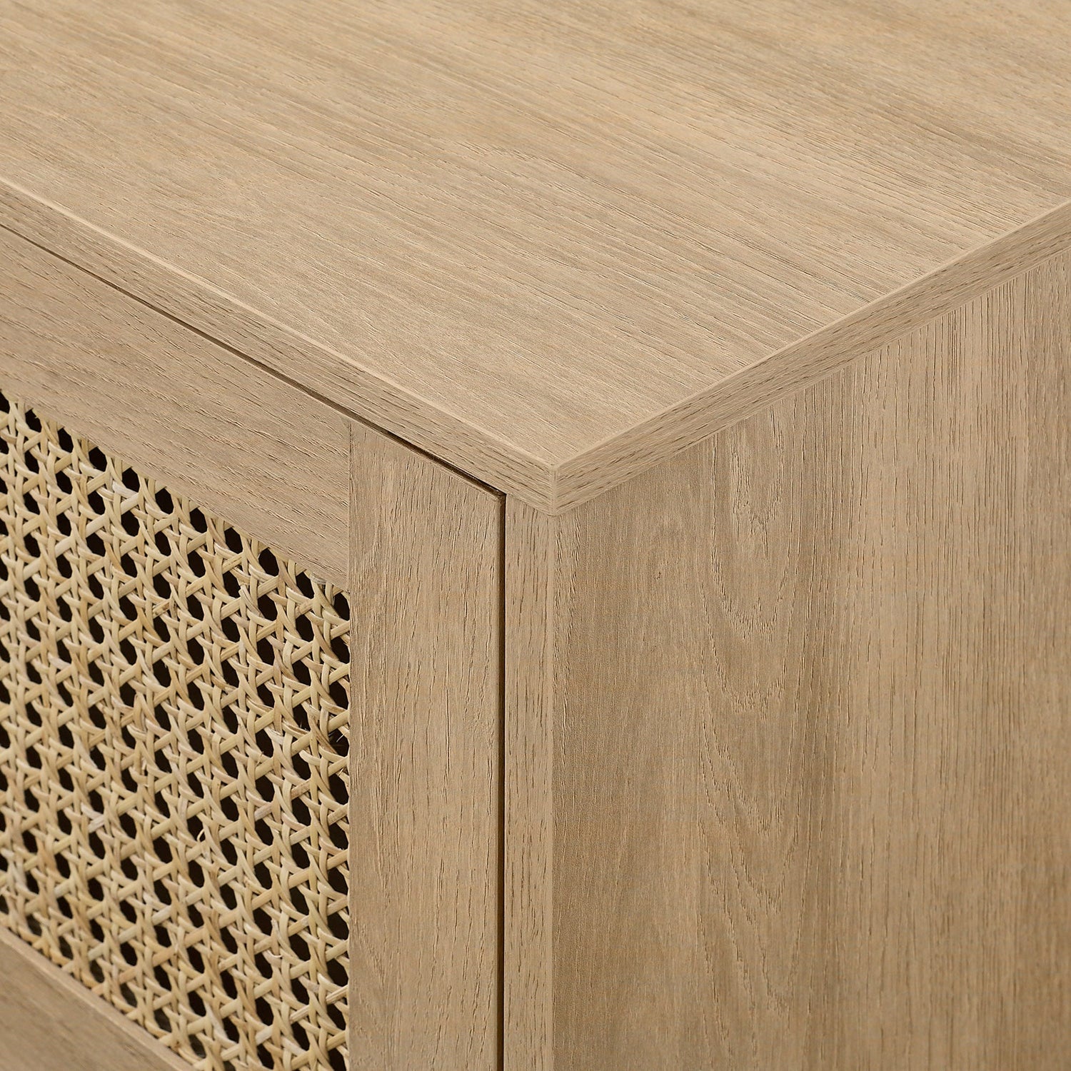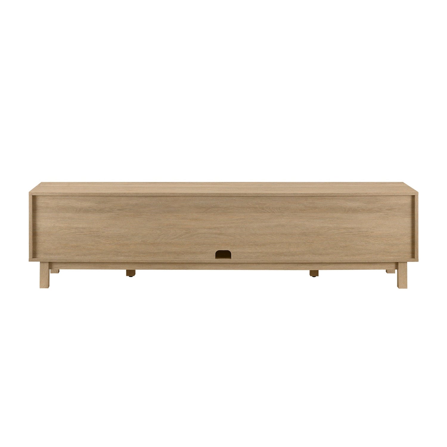 Channel surf in style with the cool, coastal aesthetic of this TV stand. Curate an epic entertainment hub with a low profile that leaves room to display décor or show off your wall-mounted TV. Use the middle open shelves to display your sound bar, streaming devices, or favorite conversation-starter books while you conceal clutter behind the rattan doors. With sleek finger pulls on each door and a cord management port, your entertainment center will be organized and ready to host a soiree or solo streaming sesh with contemporary finesse.