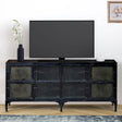Wood in Metal Frame 60-inch Wide Media Console. Crafted with a meticulous blend of rustic allure and modern sophistication, this media console seamlessly marries reclaimed wood and a sturdy metal frame to create a distinctive piece.