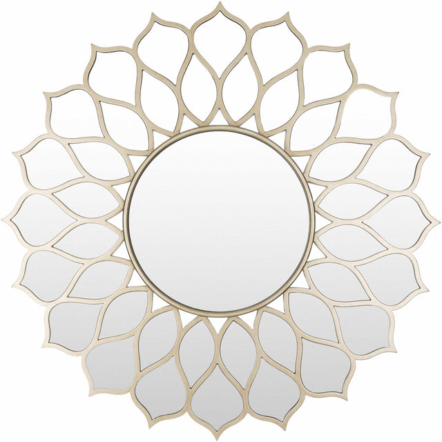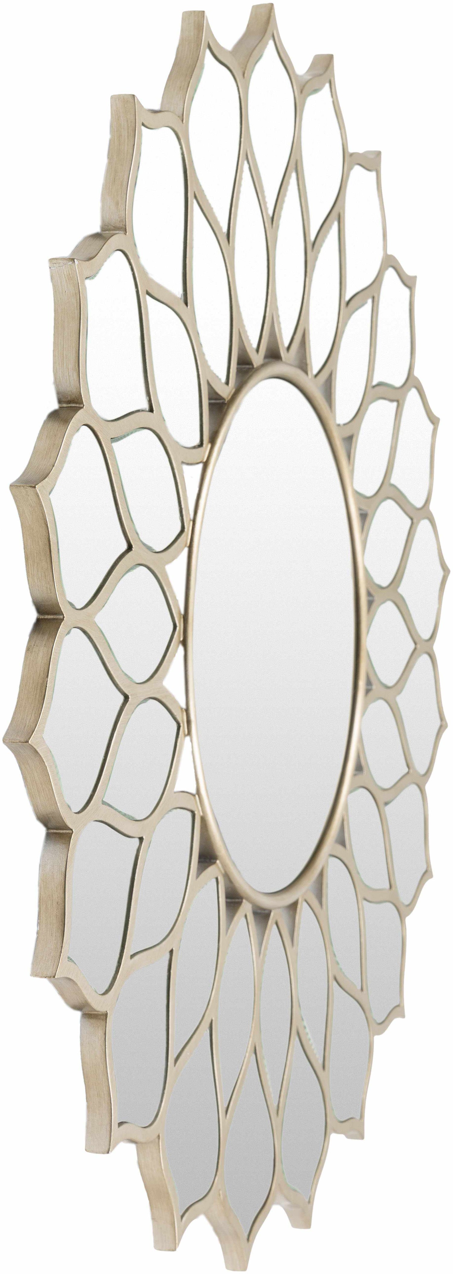 Illuminate your home with the captivating Vorderweibenbach Modern Wall Mirror, a stunning piece designed to be the focal point of any room. This exquisite mirror features a unique sunburst shape, reminiscent of a blooming flower or a radiant sun, bringing warmth and modern elegance to your space. The intricate frame, crafted from durable manufactured wood with a luxurious champagne finish, beautifully encases the central circular mirror, creating a dazzling display of light and reflection. Its contemporary style and eye-catching design make it an instant upgrade for any interior, reflecting both your taste and the beauty of your home.