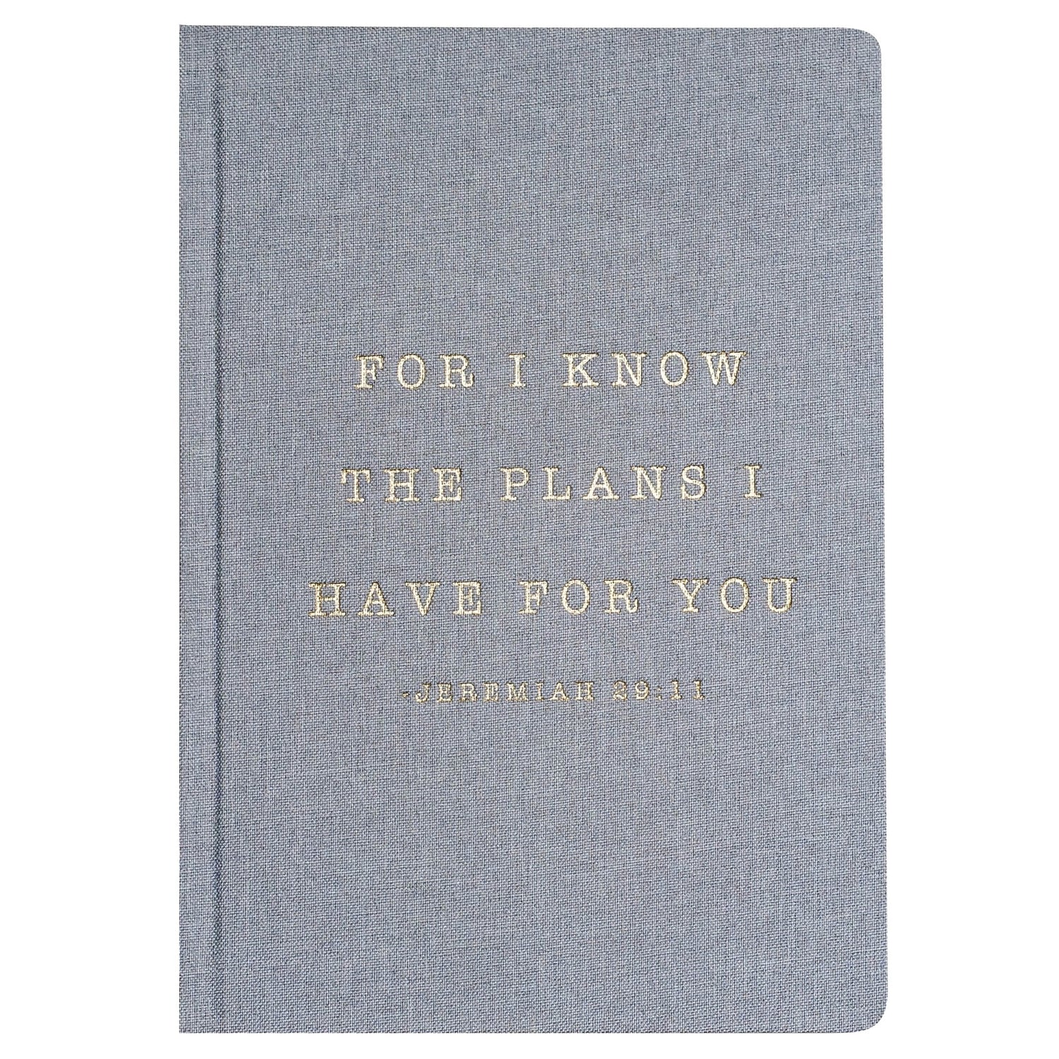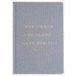 Write down all of your goals and dreams in our hand lettered For I Know The Plans I Have For You Jeremiah 29:11, Cool Grey and Gold Fabric Journal! With this chic, stylish, easy to write on notebook, there's no better place to jot down motivational notes, inspirational quotes, lists, and all of your great ideas! Perfect for work or school. This desk/office accessory makes a great gift!
