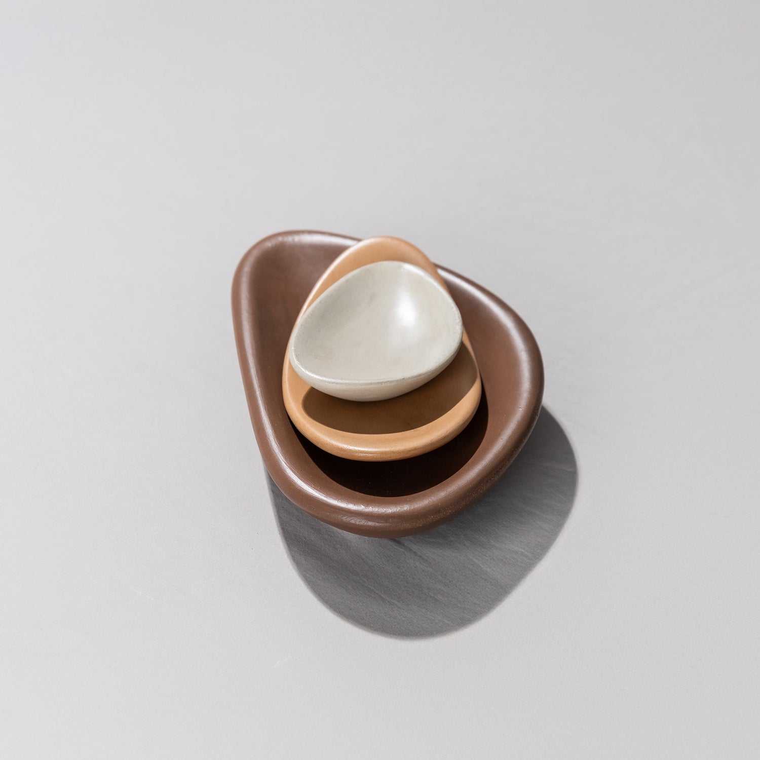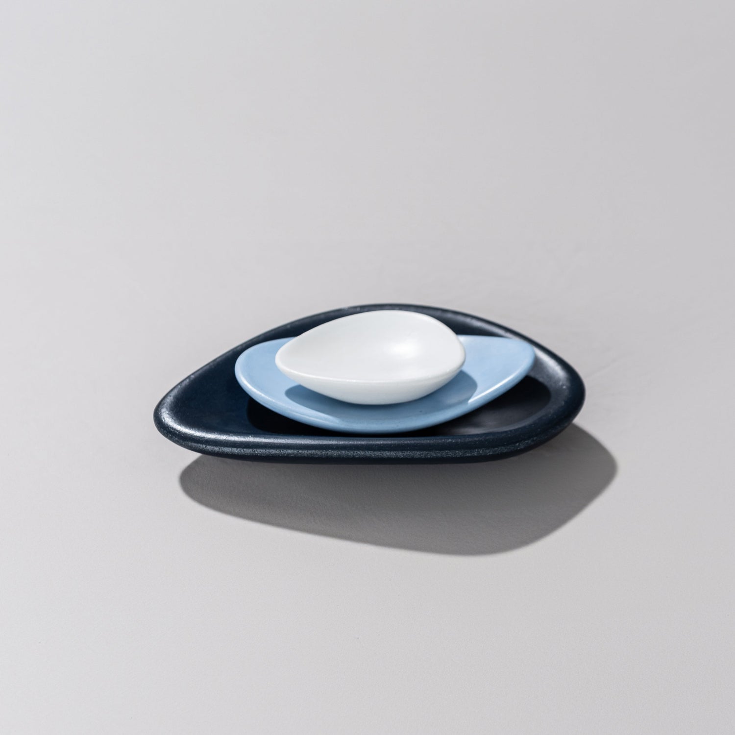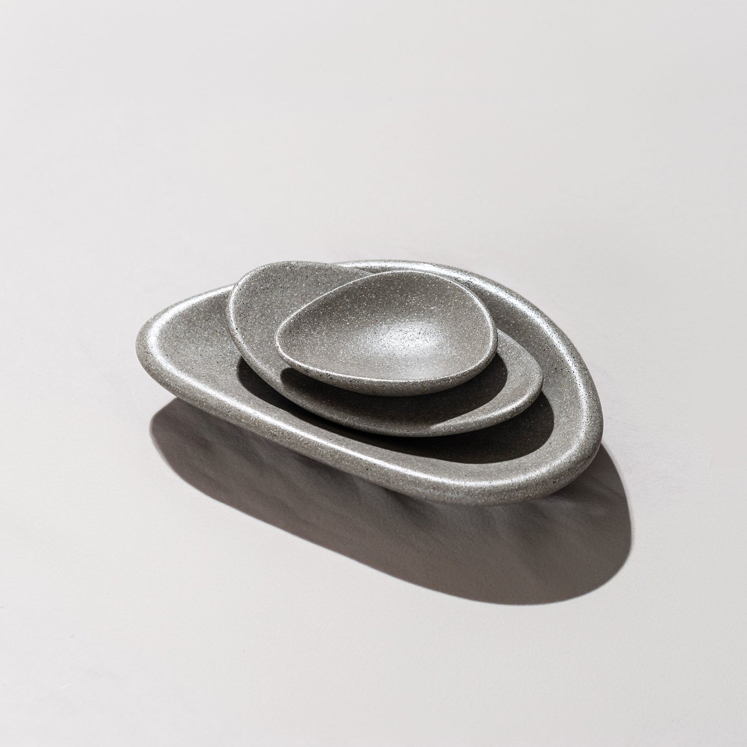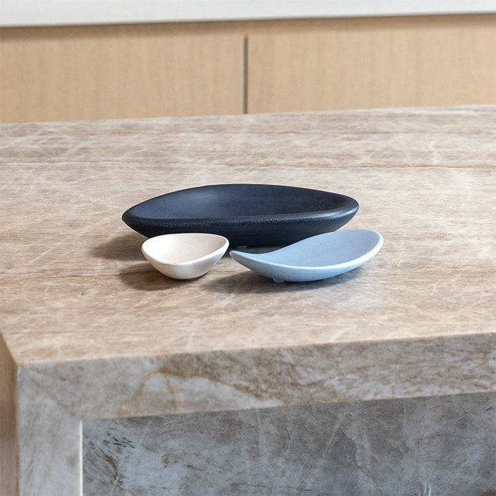 A set of three stackable catch-all dishes that looks great in any room. Use it for jewelry next to your bed, sunglasses and keys near your entryway or an object of natural beauty on your coffee table. Crafted to resemble the smooth, organic contours of ocean-touched stones, these concrete dishes are more than just a tabletop accessory; it's a statement piece that adds a touch of coastal elegance to any space.