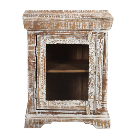 Farmhouse Style Solid Wood Carved Distressed White Nightstand With Glass Door