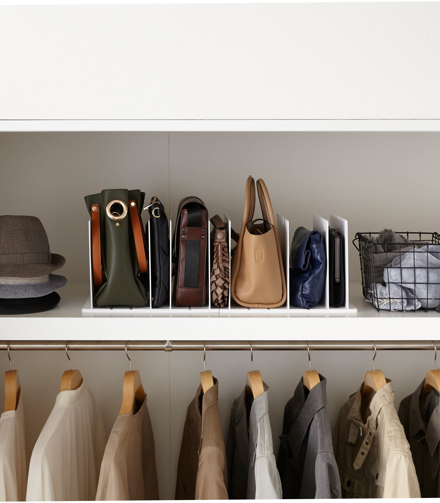 Nip it in the bag. Clutches, handbags, pocketbooks—they come in every shape and color! There’s no one-size-fits-all solution with purse storage, but this customizable organizer takes away all the frustration. Product comes with two square bases that can be snapped together or used independently. Eight vertical dividers that can slide into the grooves found in the base are also provided. Lifestyle images largely show the set of two snapped together. Lock the organizer into position according to the size of your bags to keep them all upright, perky, and pristine. Finally, a way to prevent your precious handbags from crushing one another in a giant heap.