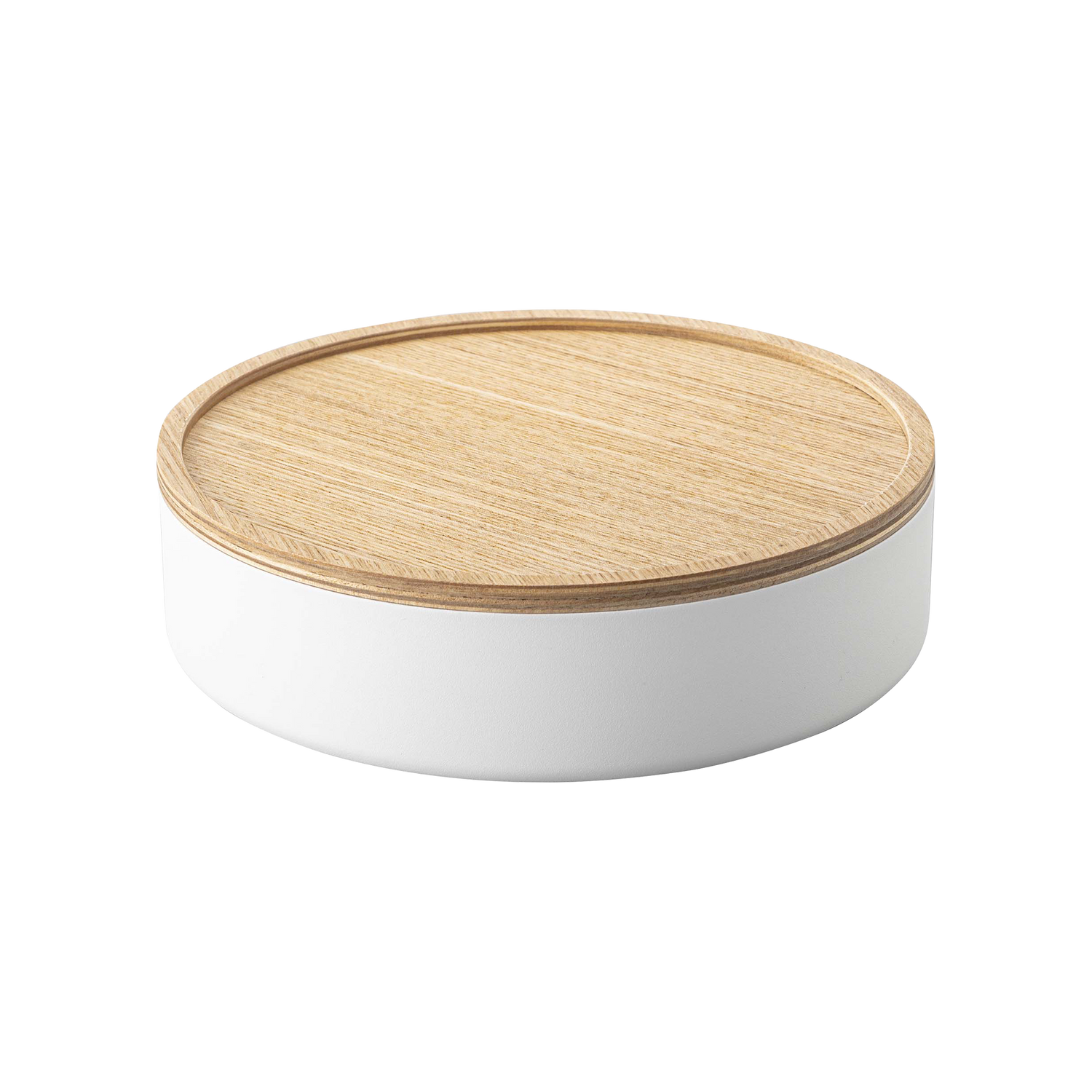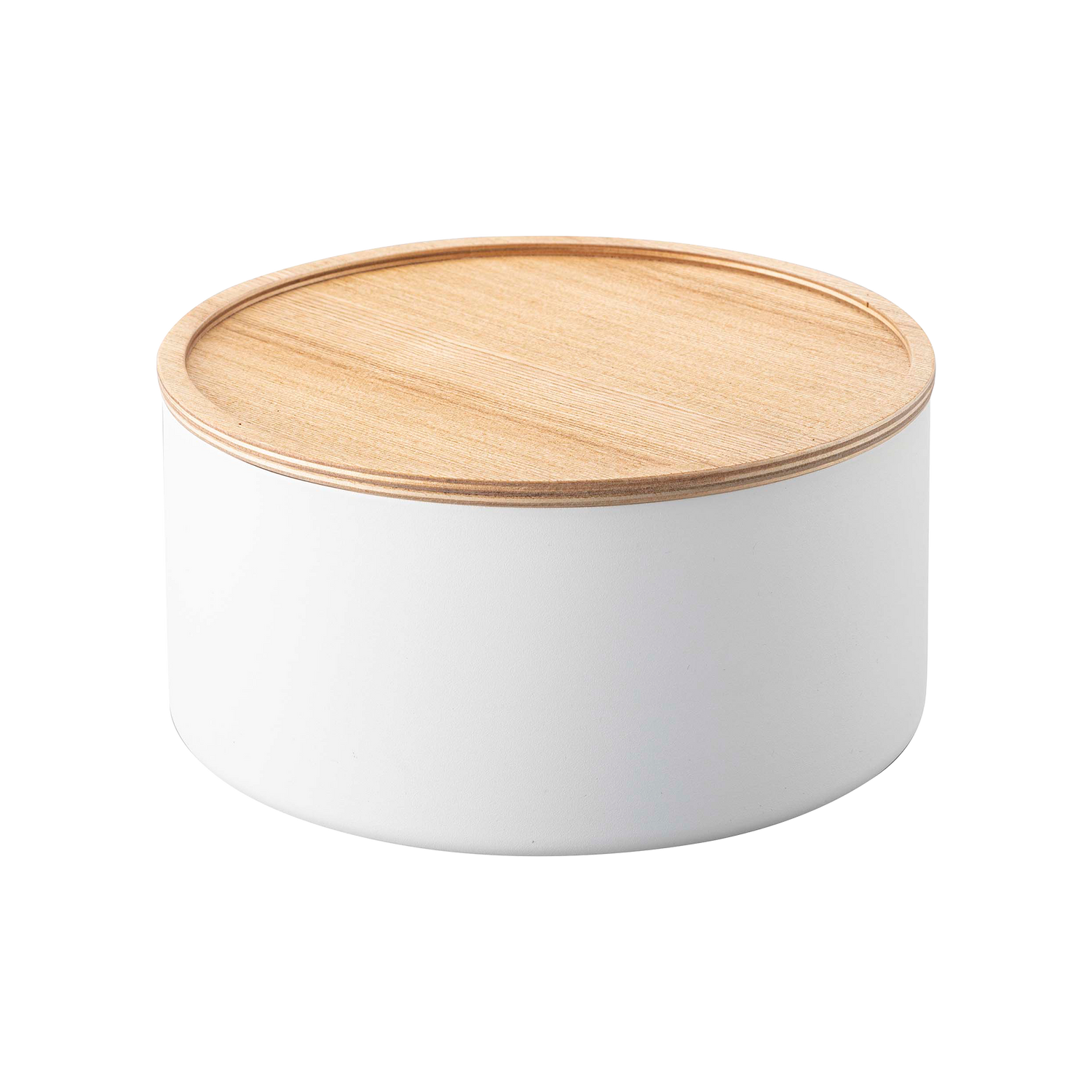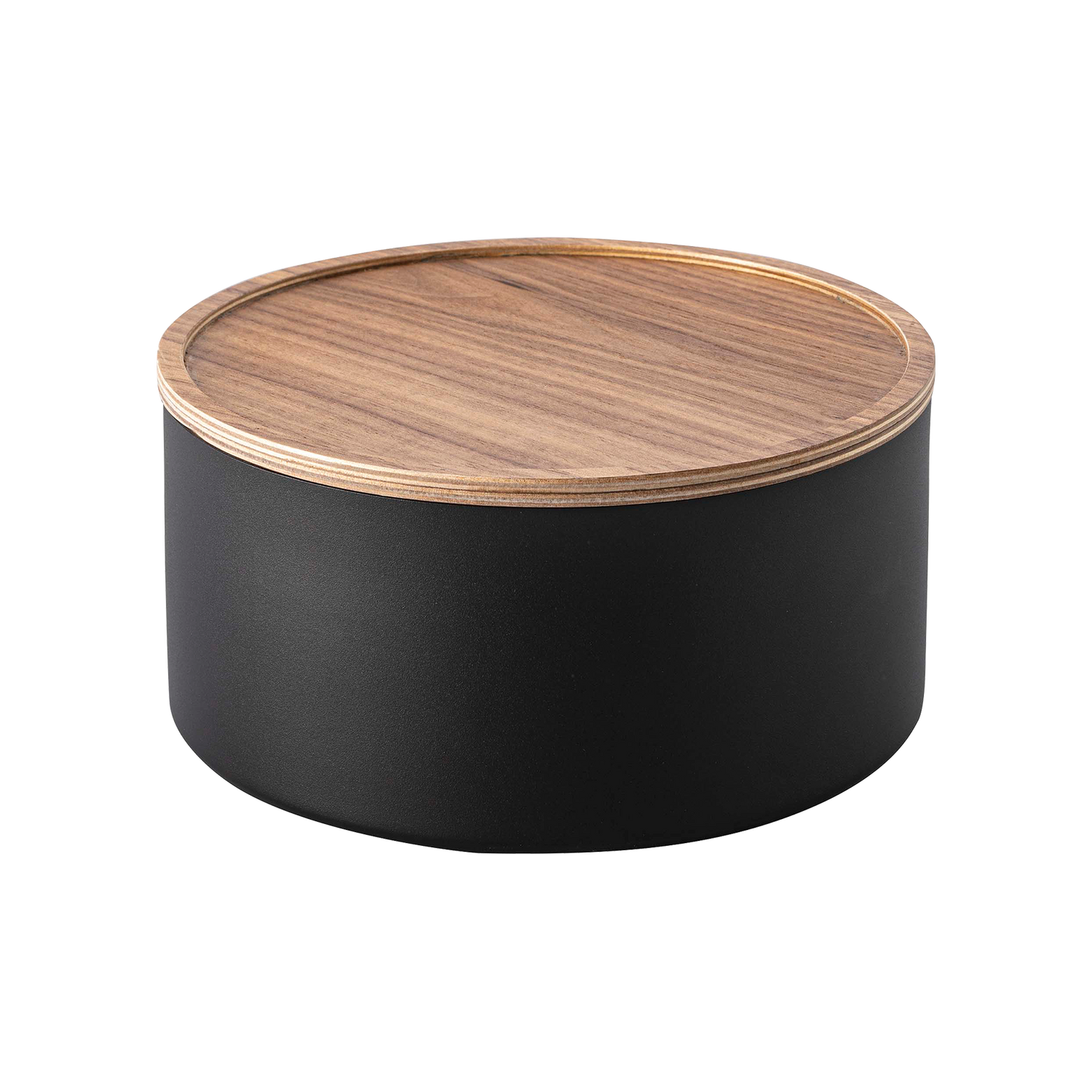 Stack up on these delightful and unique round bins, sure to spruce up any everyday assortment from your tea snacks, sewing kits, or jewelry collections. The wooden lids bring a warm aesthetic to balance the modern steel construction. They also feature a lip around the rim that allows them to double as handy trays to keep your buttons and bobbins from rolling away.