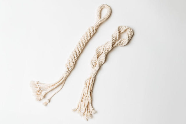 These handmade rope toys bring style and function together, allowing for interactive play with your pup while still looking good in your home. The natural, dye-free cotton rope is hand-knotted into two unique macrame designs which are perfect for tugging and pulling, toss and fetch, or even chewing.
