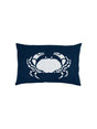 A white crab is stitched onto a pure linen navy background 100% down-filled rectangular throw pillow with a three shell button closure on its back.