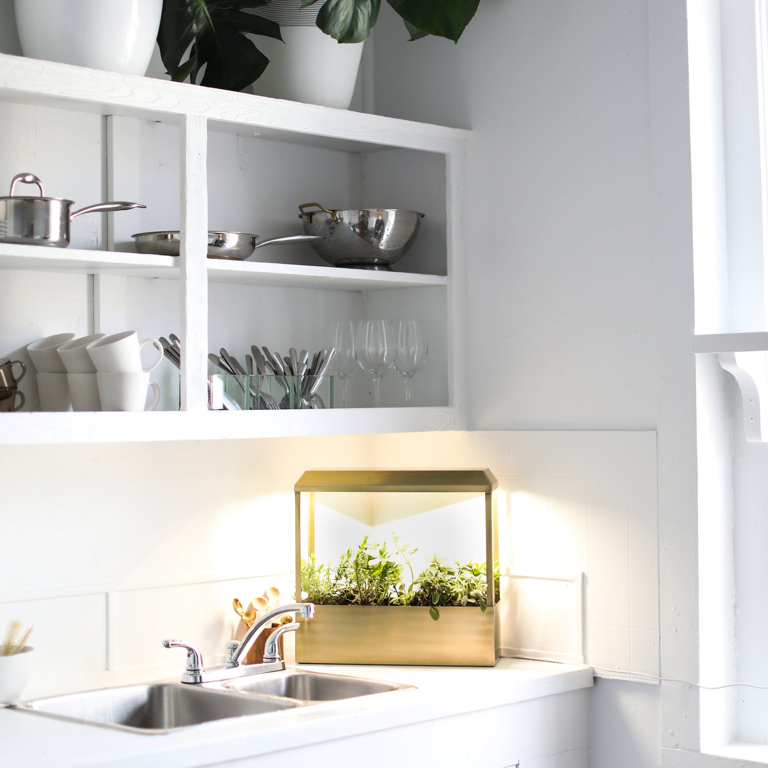 Grow fresh herbs and plants anywhere in your home, no natural light required. Made of high quality metal with a watertight planter, Growhouse features full-spectrum LED grow light that emits a warm light that doesn't feel harsh in your living space. Smart App allows for custom scheduling and brightness. Choose from Antiqued Brass or Matte Black finish. Plants will thrive and make a statement. Backed by our 3 year warranty.