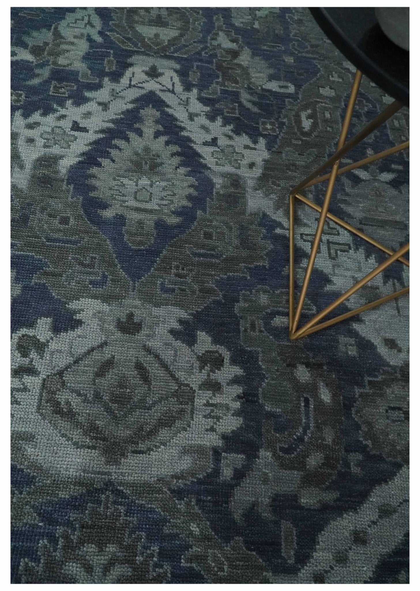 This classic Antique look Oushak Wool Area Rug is expertly hand knotted with an Ikat Pattern featuring charming shades of Blue, Charcoal and Silver. Perfect to add a traditional touch to any room.