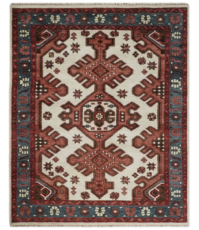 Coral Rust and Ivory Hand Knotted Traditional Heriz Serapi Multi Size Wool area Rug