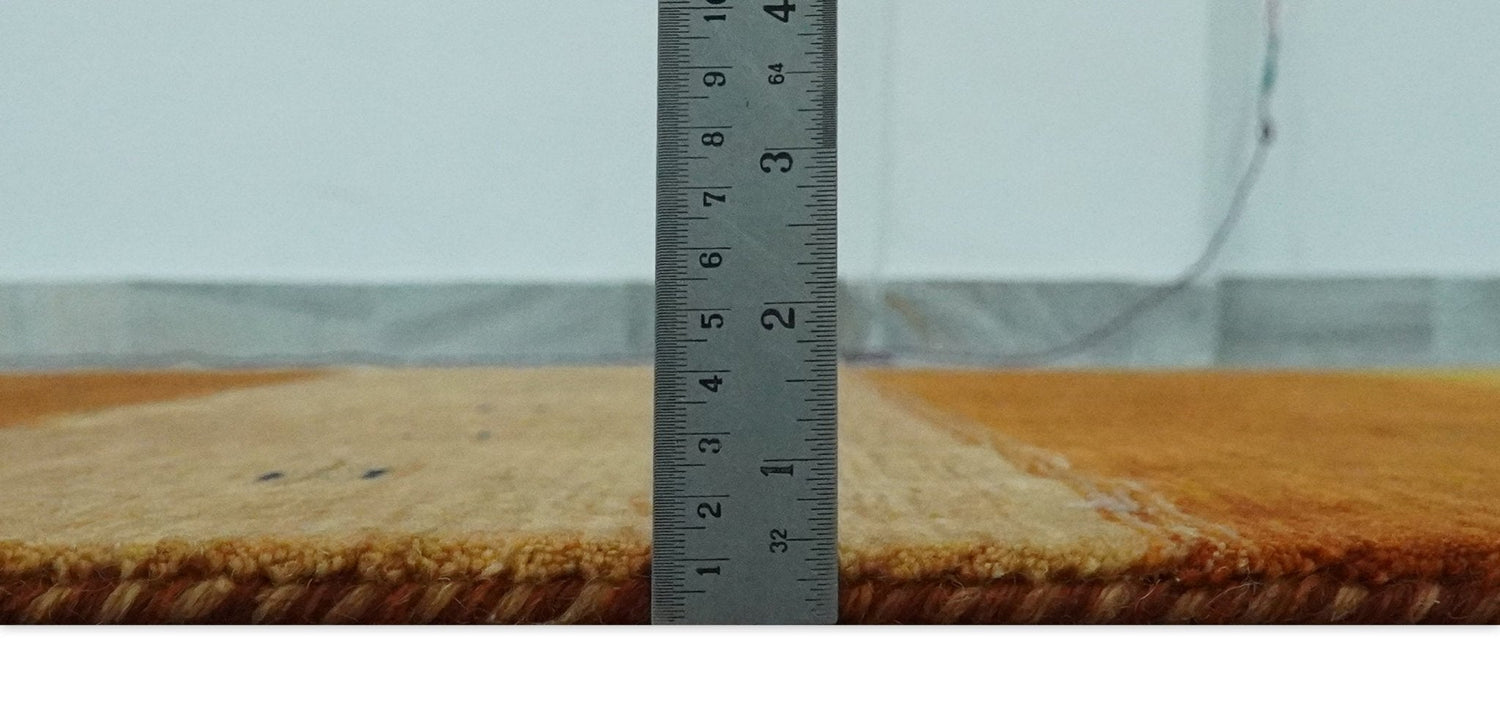 This custom-made Tribal Gabbeh rug features a unique blend of blue, brown, gold, and rust tones, handcrafted with a sturdy wool material. The bold geometric stripes design adds a touch of tribal character to any room, making it a stylish and durable addition to your home decor.