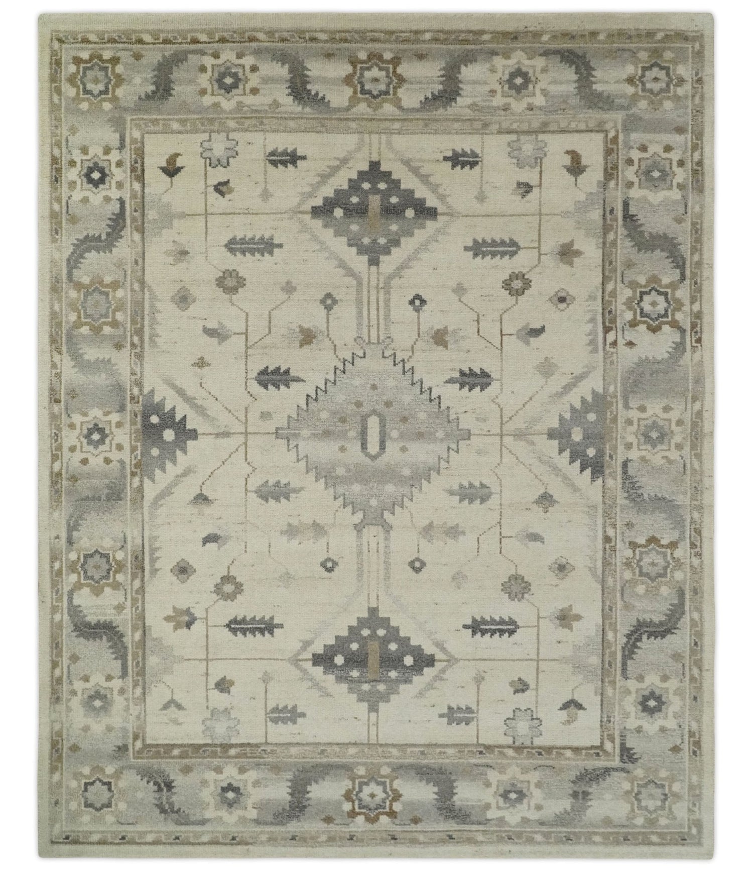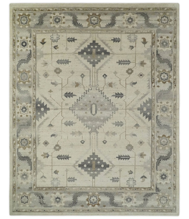 Custom Made Hand Knotted Ivory and Charcoal Traditional Tribal Natural Wool Area Rug, Kids, Living Room and Bedroom Rug