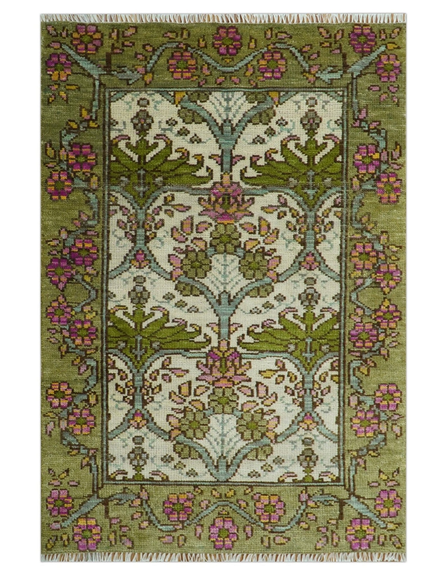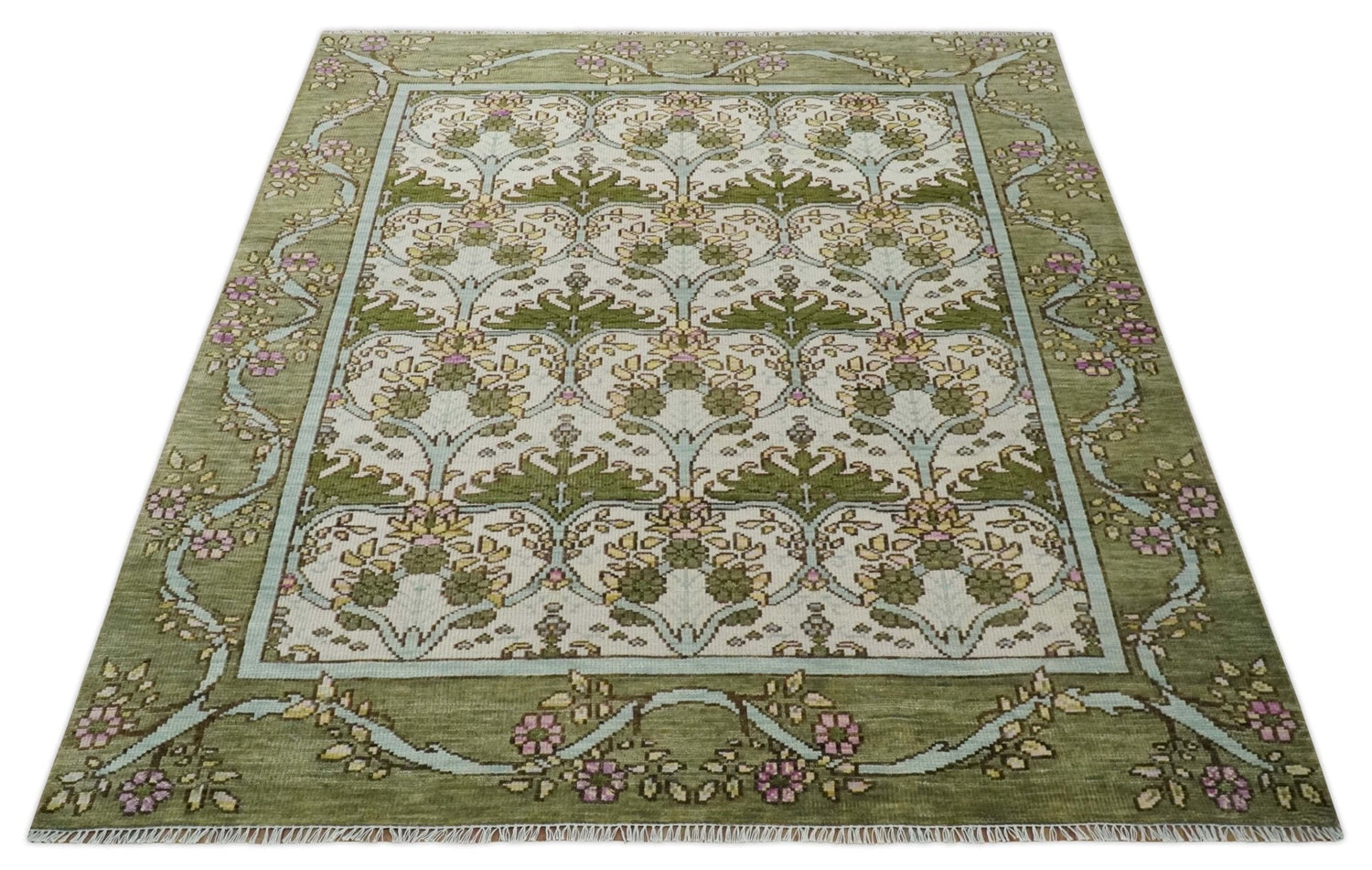 Custom Made Hand Knotted Ivory and Green Floral Traditional Antique Style Wool Area Rug