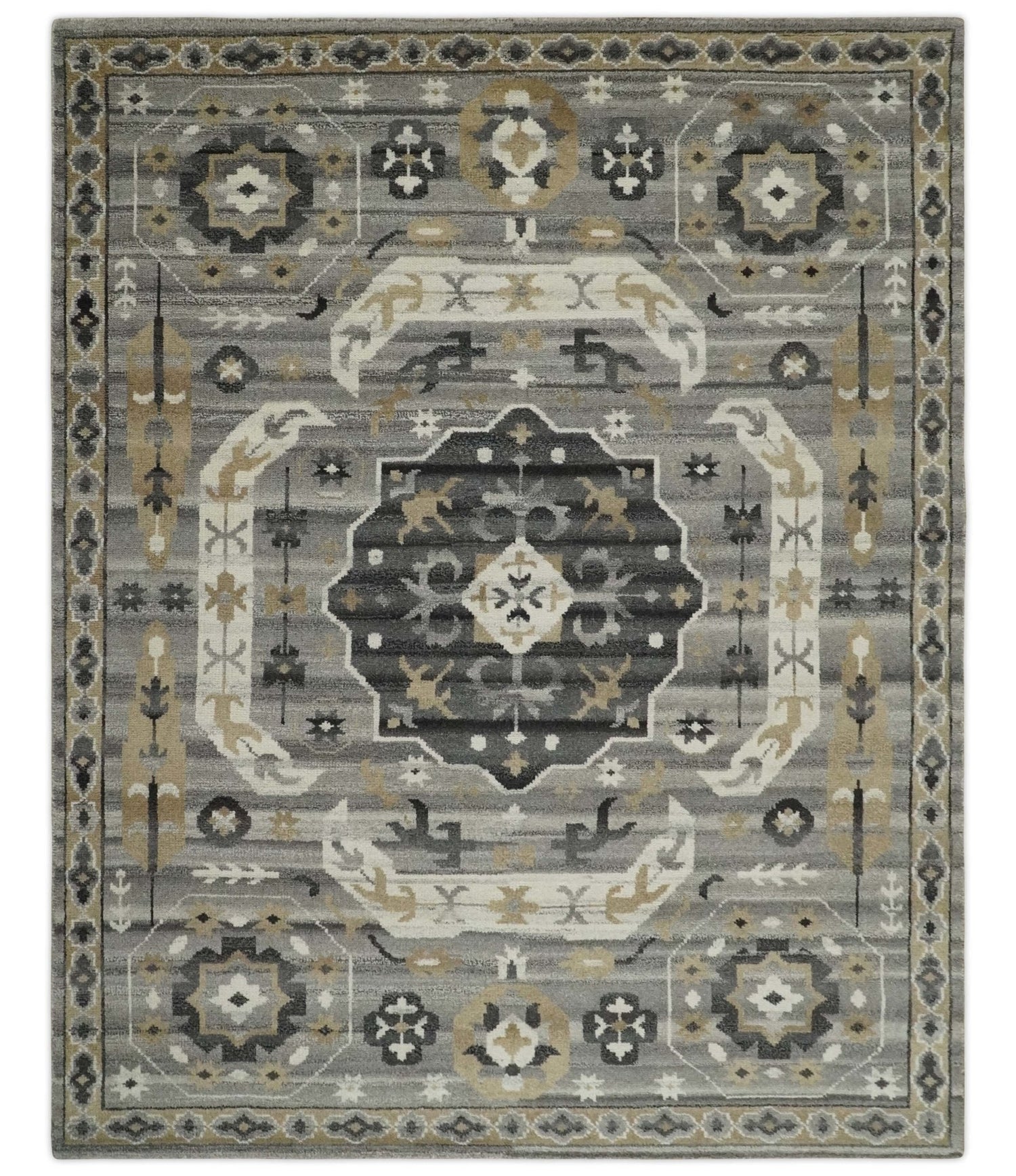 Hand Knotted Charcoal, Ivory and Beige Traditional Medallion Natural Wool Multi Size Area Rug, Kids, Living Room and Bedroom Rug