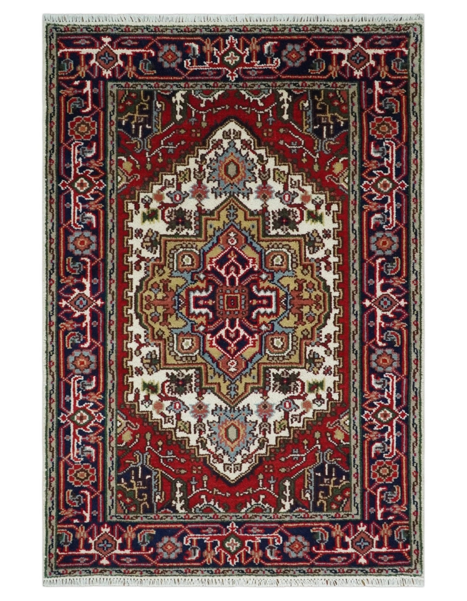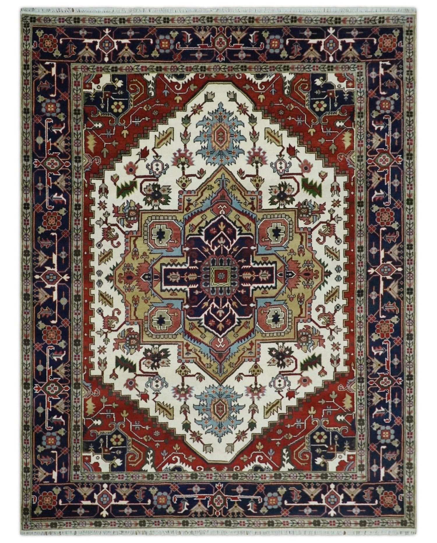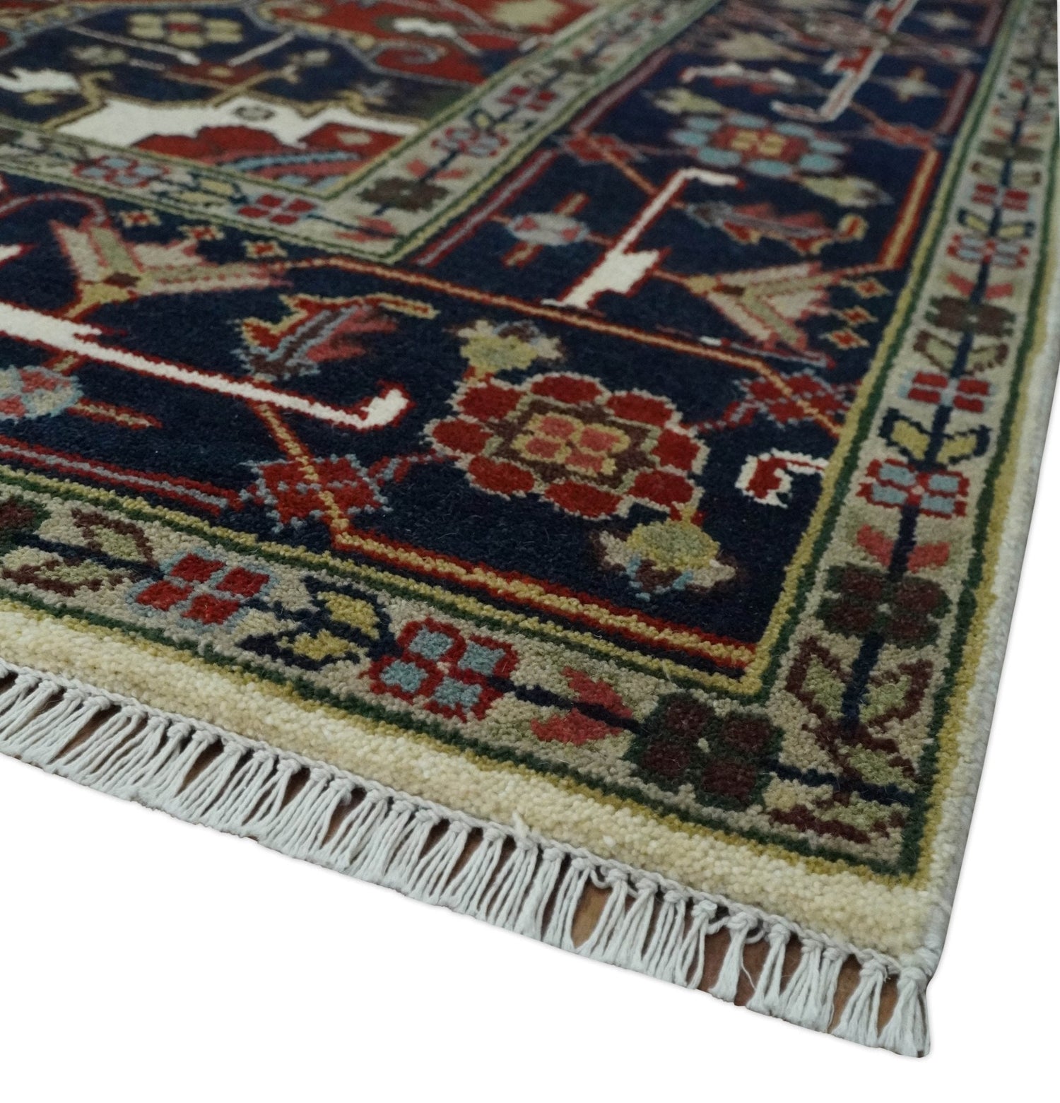 This traditional area rug features a unique Heriz Serapi design, woven with wool in shades of Ivory, Brown and Blue. The multi-size gives subtle variety to the room, creating an elegant and timeless atmosphere.