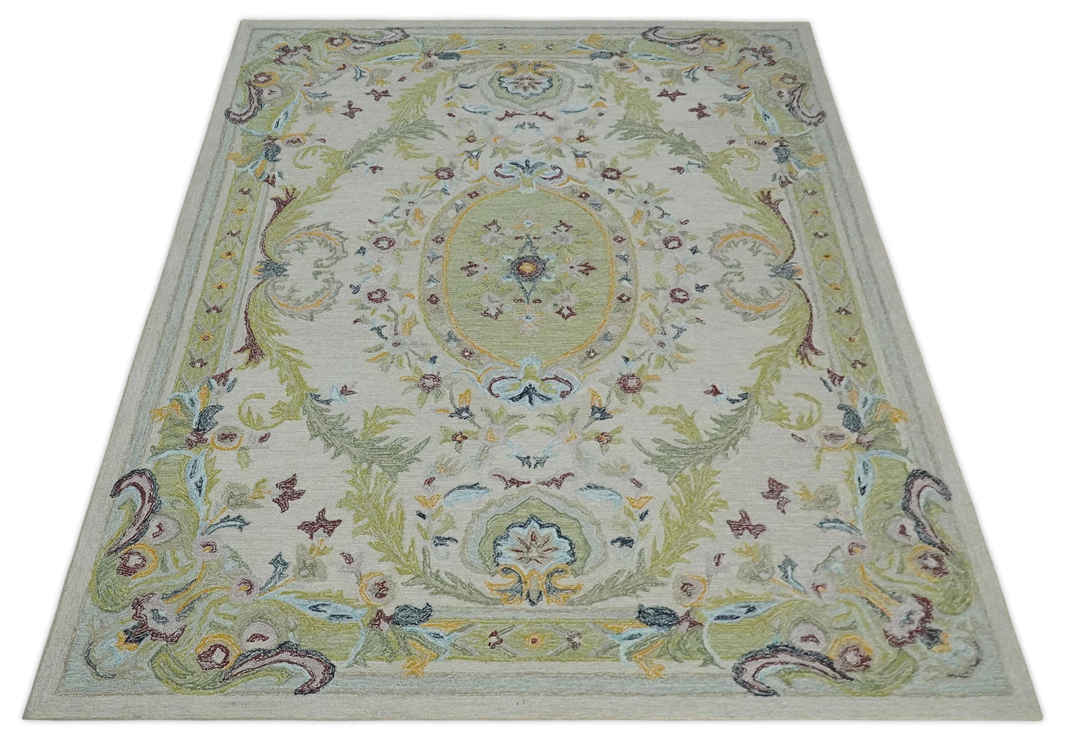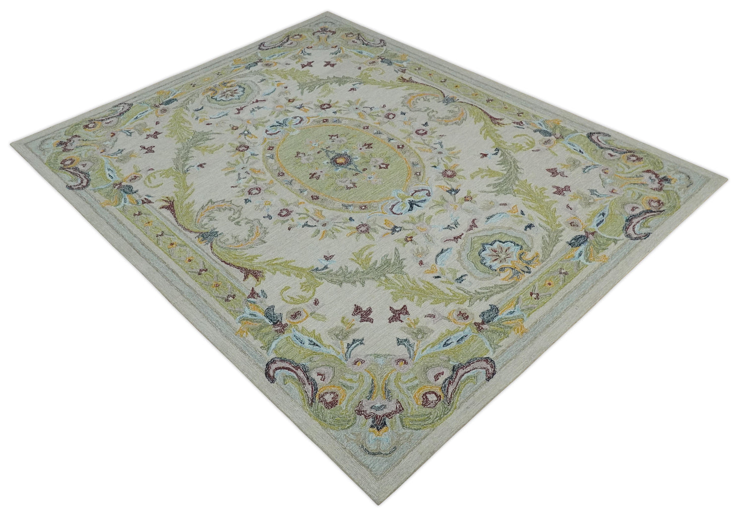 Ivory and Green Custom Made French Design Aubusson Hand Tufted Wool Area Rug
