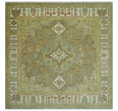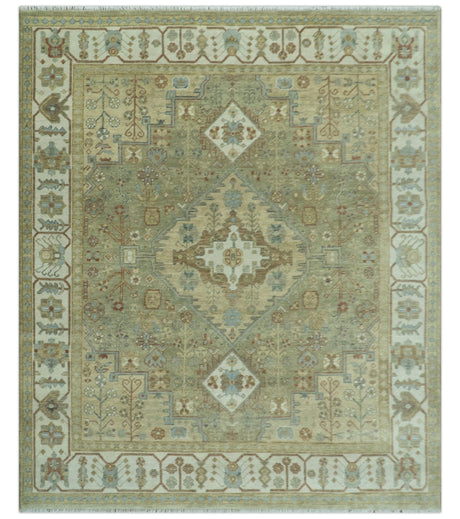 Antique Look Hand Knotted Medallion Olive and Ivory Vintage Style Wool Rug