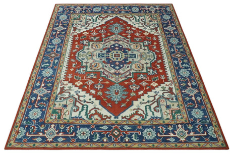 Custom Made Traditional Rust, Ivory and Blue Heriz Medallion Wool Area Rug