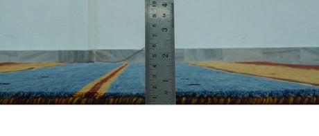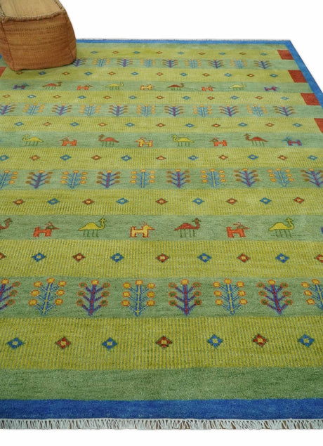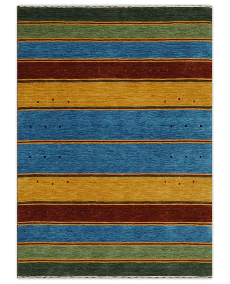 Custom Made Modern Geometrical Blue, Gold, Brown and Green Stripes Design Wool Area Rug