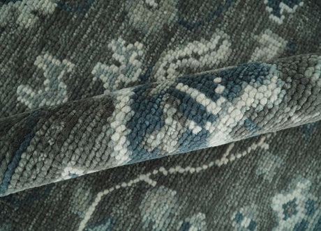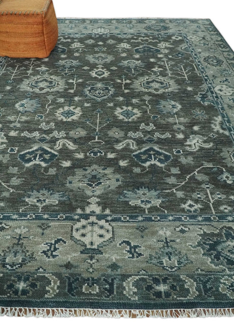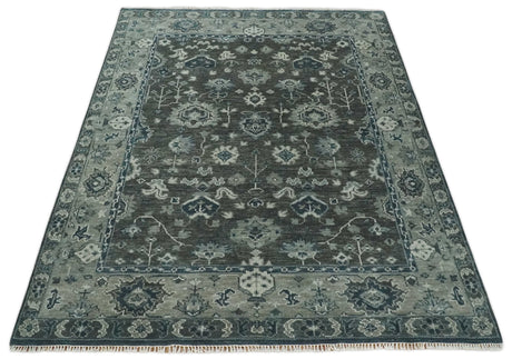 Antique Charcoal Hand Knotted Oushak Silver and Blue Traditional Wool Rug