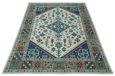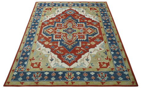 Custom Made Colorful Ivory, Blue, Brown and Teal Hand Knotted Traditional Heriz size wool Area Rug
