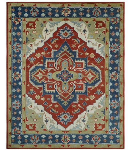 Custom Made Brown, Blue, Ivory and Olive Traditional Heriz Medallion Wool Area Rug
