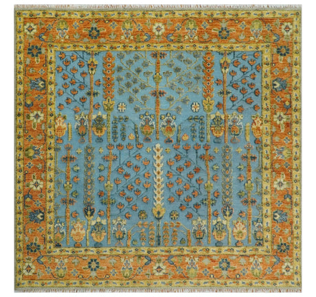 Custom Made Hand Knotted Blue and Rust Tree Design Low pile Wool Area Rug