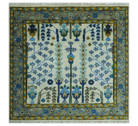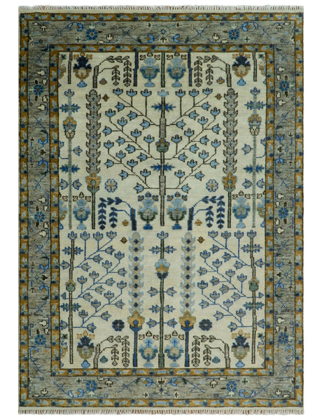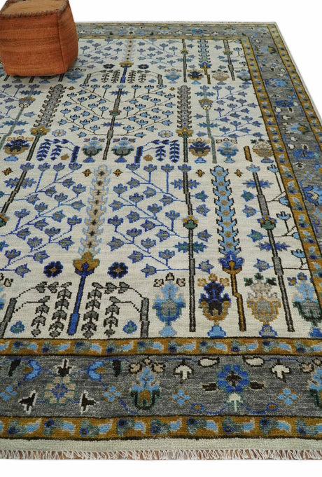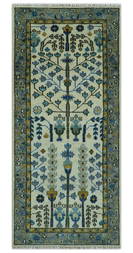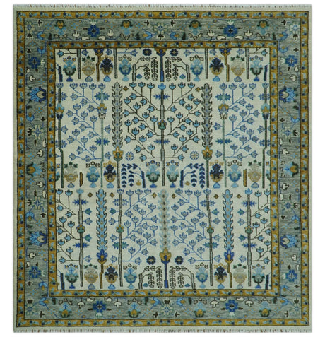 Custom Made Tree of life Hand Knotted Antique Ivory, Blue and Gray Traditional Oushak Wool area Rug