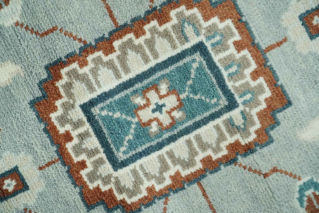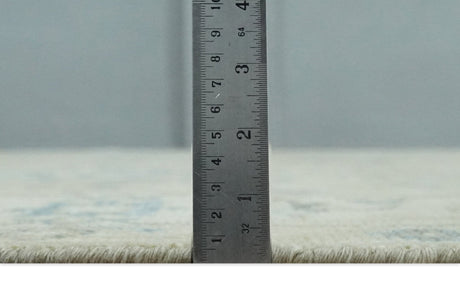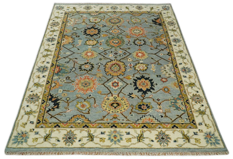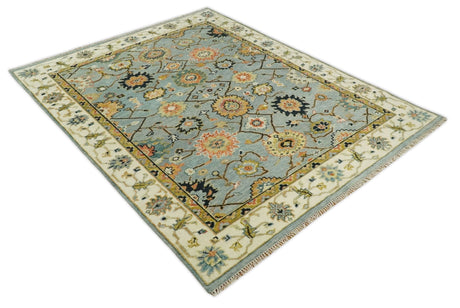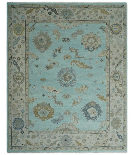 Hand Knotted Aqua, Beige and Ivory Traditional Oushak Wool Rug