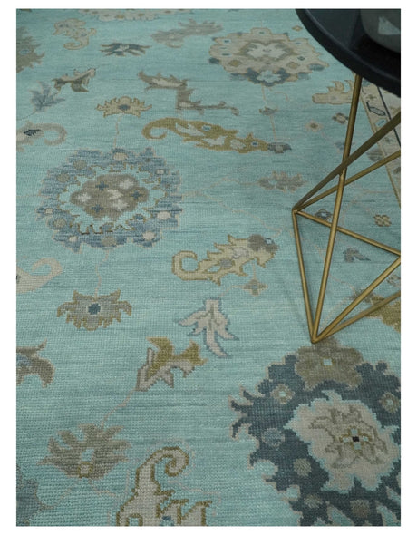 Custom Made Hand Knotted Teal, Blue and Ivory Traditional Oushak Wool Area Rug