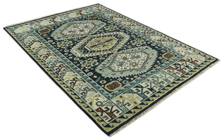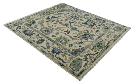 Beige, Charcoal and Green Hand knotted Oushak Traditional Wool Area Rug