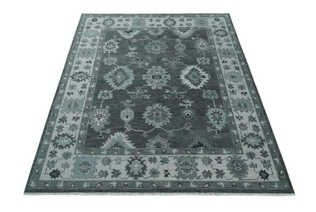 Antique Hand Knotted Charcoal and Ivory Traditional Oushak Wool Area Rug