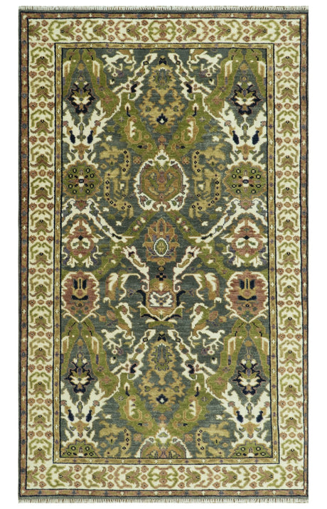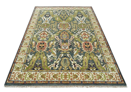 Antique look Hand knotted Green, Ivory and Gray Traditional Large design Multi Size wool Area Rug
