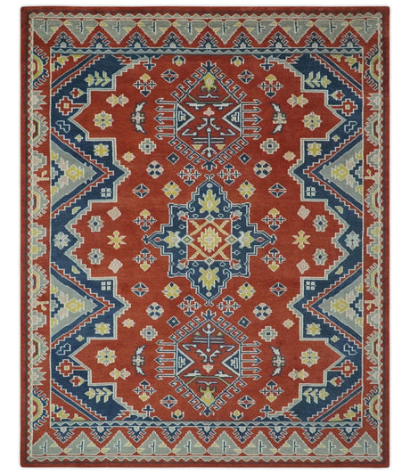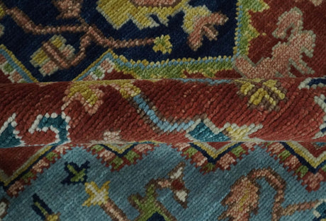 Custom Made Rust and Blue Traditional Medallion Hand Knotted Wool Area Rug