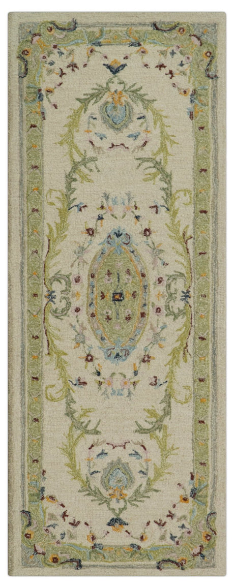 Ivory and Green Custom Made French Design Aubusson Hand Tufted Wool Area Rug