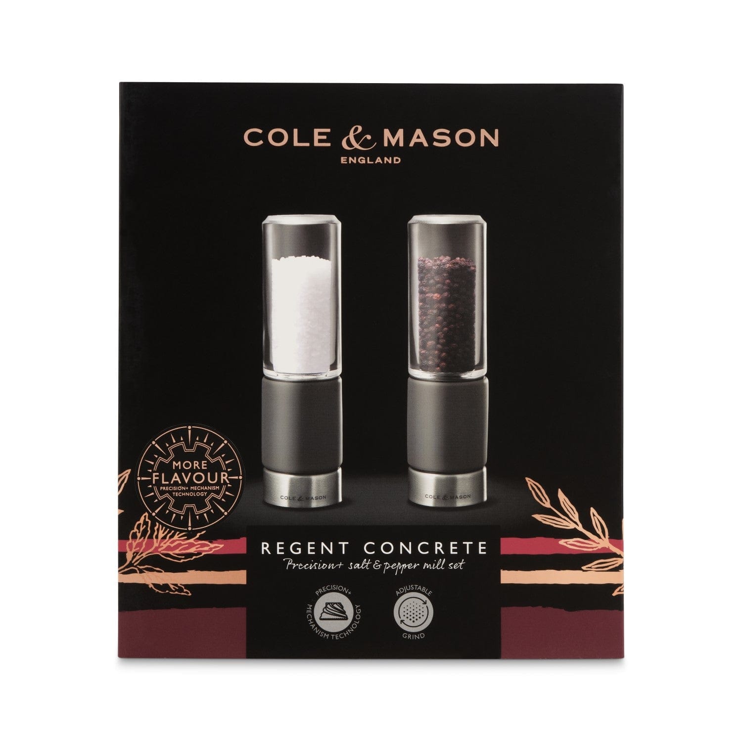 Featuring Cole & Mason Precision+ mechanisms, this salt and peppermill giftset ensures maximum flavor from every turn. Both mills come partially filled with whole black peppercorns from Vietnam and coarse sea salt from Belgium. When you need to refill your mills, simply turn them upside down and unscrew the acrylic top from the concrete base.