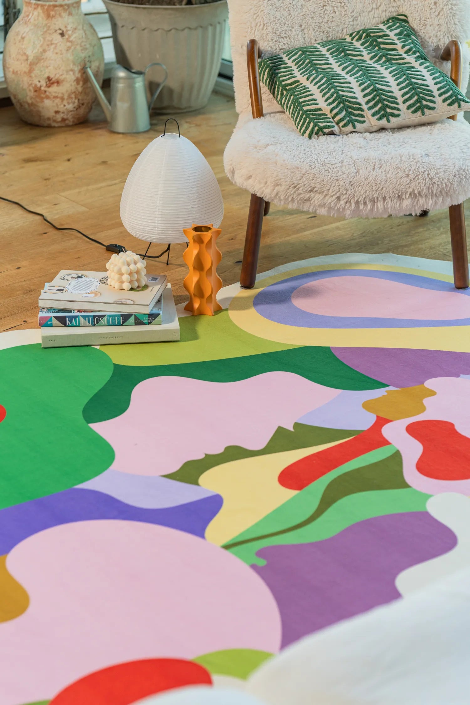 Soft, dreamy, and full of life, this rug brings an abstract garden of colors to your space. Fluid forms in lavender, peach, sage, and ivory blend together, evoking a sense of harmony and natural beauty. The irregular shape mirrors the organic nature of its design, making it feel like a living artwork underfoot. Crafted from ultra-soft, pet-friendly polyester, it’s perfect for adding a serene yet expressive touch to your home.