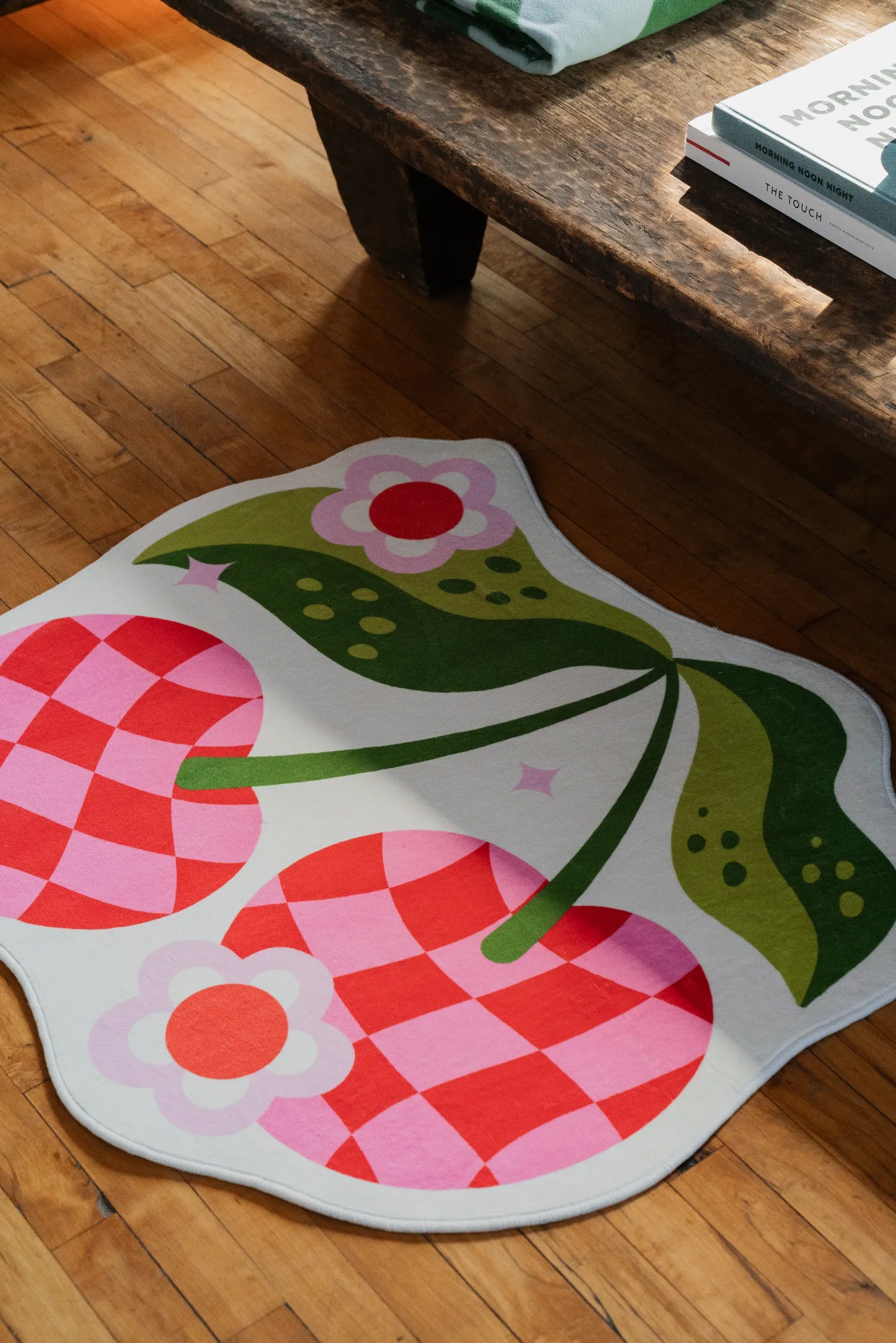 Playful and sweet, this cherry-shaped rug blends vibrant red, soft pink, and lush green for a fresh and nostalgic feel. The checkered pattern within the cherries adds a whimsical twist, reminiscent of vintage picnic aesthetics. Its irregular shape makes it feel like a hand-drawn illustration come to life. Made from ultra-soft, pet-friendly polyester, this rug brings a cheerful charm to any space.