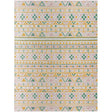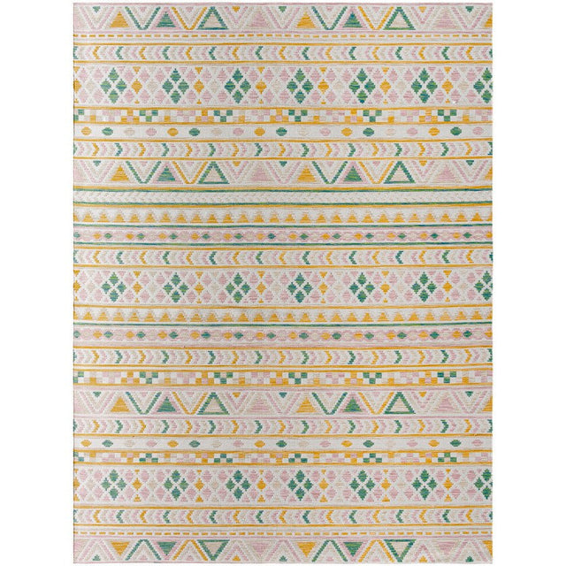 Infuse your living space, patio, or any area in between with the captivating charm of the Latroy Coastal Blush Green Area Rug. Woven in Turkey by skilled artisans, this rug showcases a delightful bohemian-inspired pattern in a refreshing palette of off-white, mustard, light brown, rust, and pale blue. Crafted from durable 100% Polypropylene, this machine-woven rug is designed to withstand daily life while adding a touch of artistic flair to your surroundings. Its no-pile construction makes it a practical and stylish choice for high-traffic zones, and its weather-resistant nature ensures it can effortlessly transition from your living room to your outdoor deck.