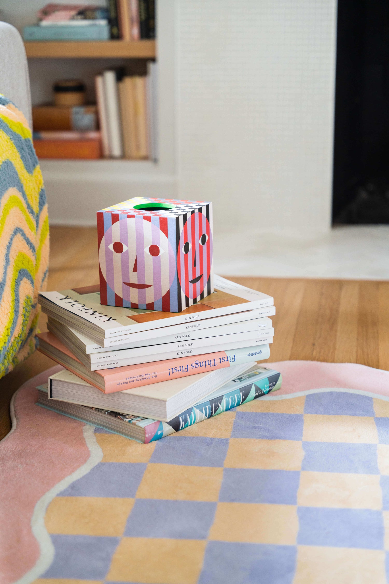 A cute, pastel rug boasting a yellow and purple checkered rug, accented by a charming pink wavy border. It offers the practicality of making this multi color rug both visually appealing and functional. This rug is a perfect addition to any space with its playful design and practical features.