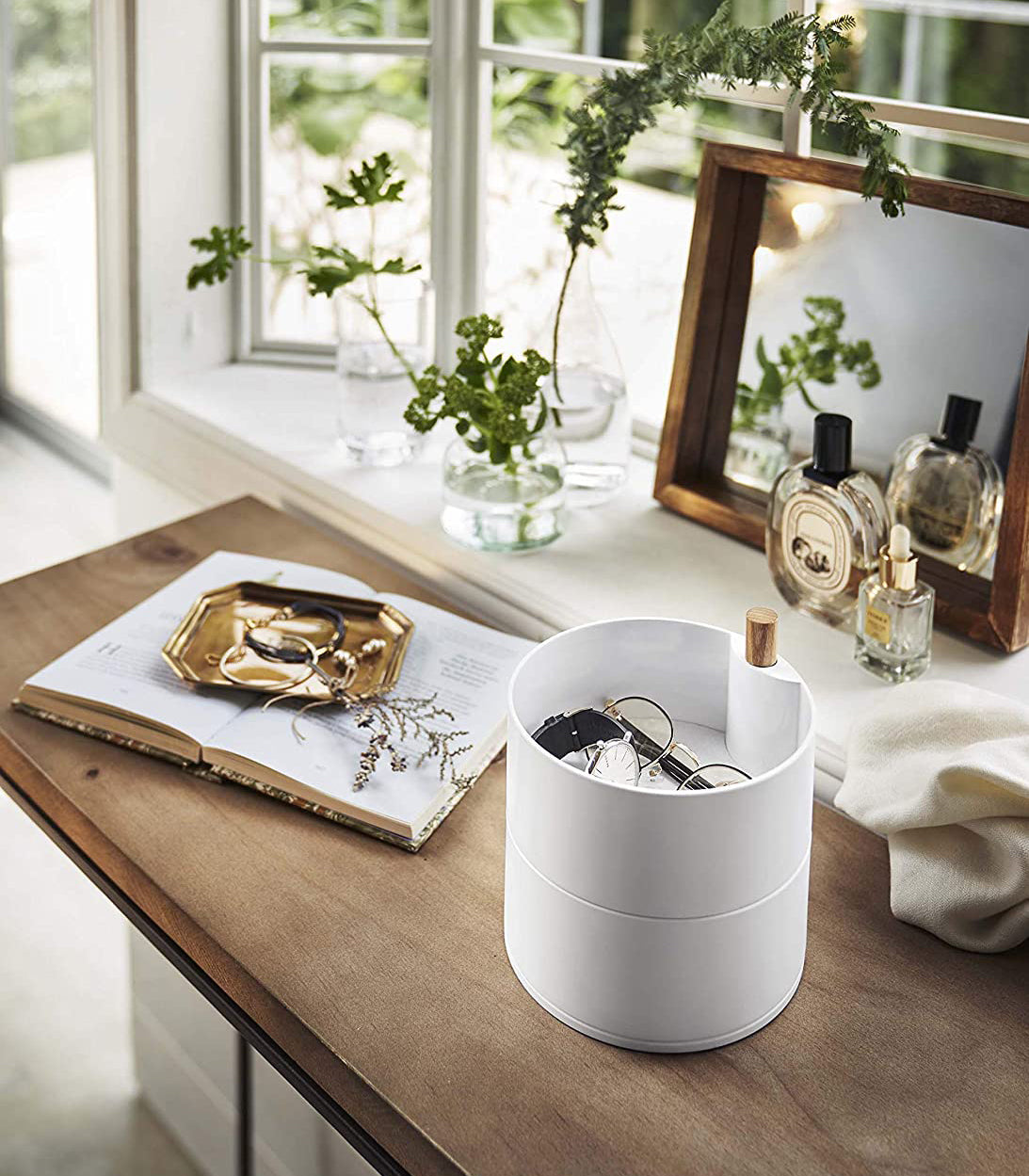 Stack it, Spin it, Bop it! Okay, they don’t bop, but these tiered jewelry organizers will protect your beloved baubles and precious pearls in their elegant, compact compartments. Fan out the trays to make your accessory selection when you’re getting ready to slay the day (or night). Large: Two wider tiers provide plenty of space to hold larger accessories like glasses and shades, watches, or statement pieces. A more spacious solution for slightly bulkier items. The small version is available Here
