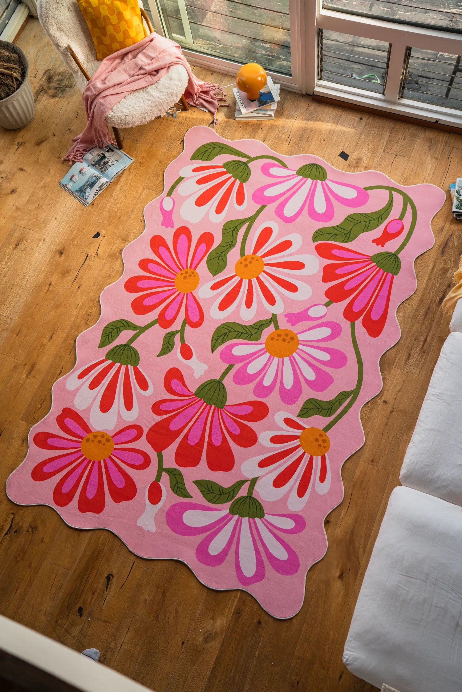Soft curves, dreamy florals, and an unmistakable artistic touch—this wavy-edged rug is pure charm. Set against a gentle pink base, vibrant florals dance across the surface, bringing a fresh, feminine energy. The wavy edges create an effortless sense of movement, making it feel more like a freeform design than a structured rectangle. Crafted from ultra-soft, pet-friendly polyester, it’s a perfect choice for bedrooms, creative studios, or anywhere that calls for a cozy yet stylish flourish.