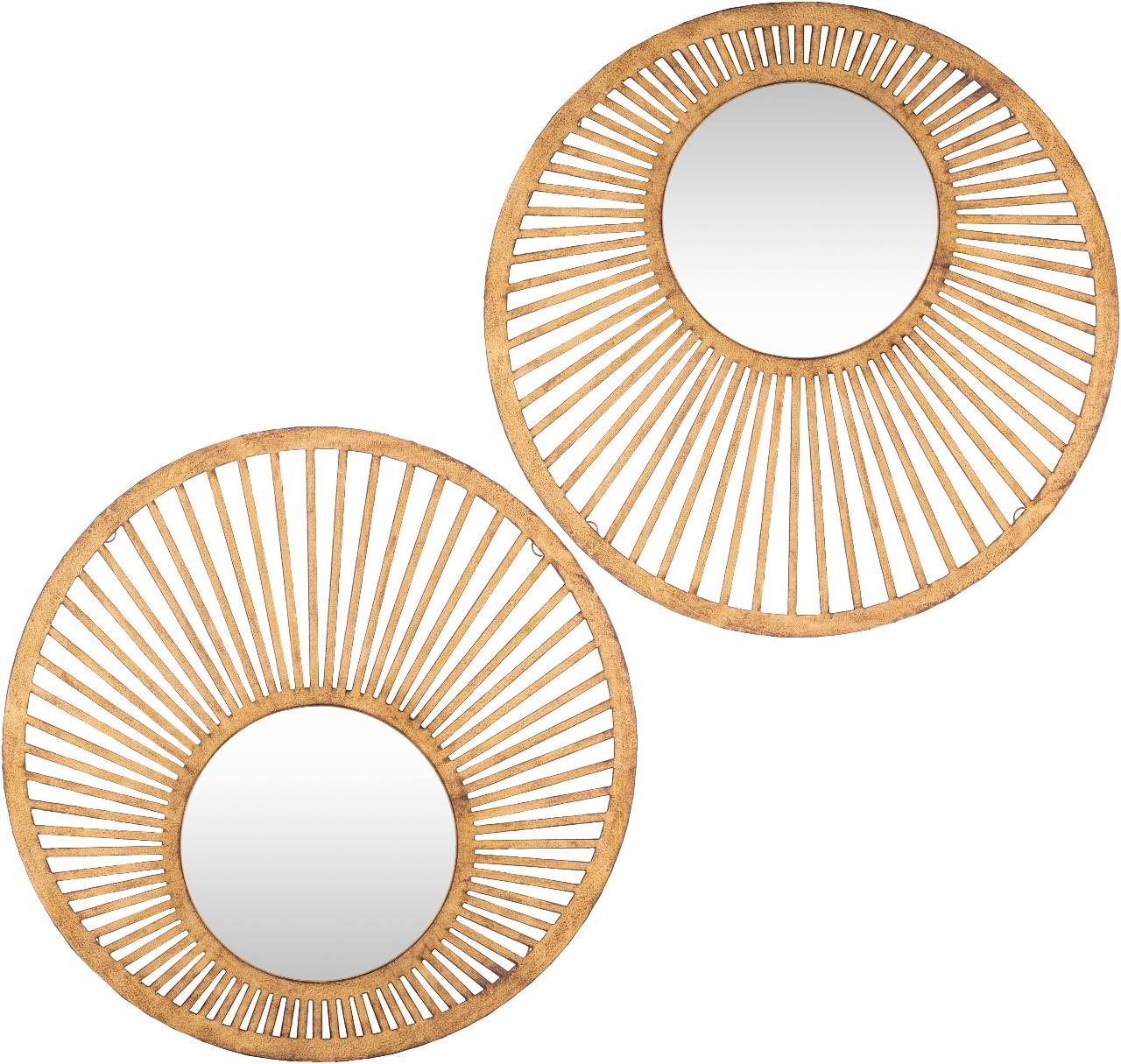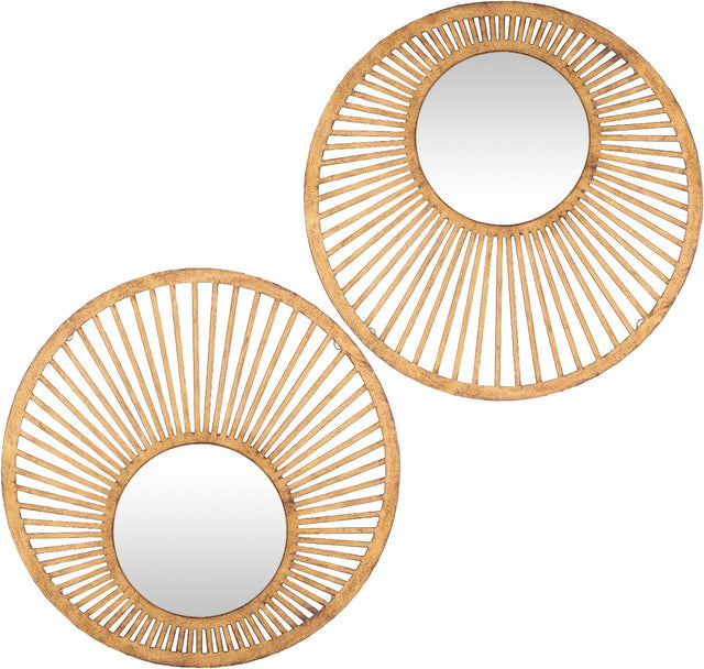 Introduce a captivating blend of modern style and artisanal charm to any room with the Reuthe Modern Wall Mirror (Set of 2). This exquisite set of mirrors is designed to be more than just reflective surfaces; they are unique decorative accents that infuse your home with warmth and light. Each mirror is meticulously crafted from durable iron, showcasing a captivating hand-finished and hand-painted design that ensures a truly one-of-a-kind look. Their intricate sunburst-inspired frames and radiant gold color make them a stunning addition, promising to be a delightful conversation starter at your next gathering.