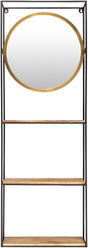 This modern-style Traunkirchen Modern Wall Mirror is the perfect addition to any room. Made of sturdy metal with a sophisticated brass finish, this mirror will stand the test of time and look beautiful for years to come. Featuring a unique design with a round mirror encased in a gold-toned frame and complemented by manufactured wood shelving, the Traunkirchen Mirror offers both reflective beauty and practical display space. With its vertical orientation, it's versatile enough to enhance any space, large or small. This product is made in India with care and attention to detail.