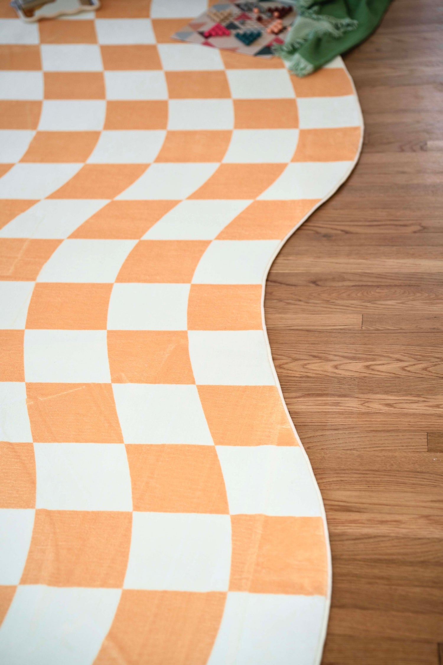 Elevate your space with this geometric and abstract mustard checkered rug, featuring a timeless yellow checkered pattern. The intricate arrangement of checkered and wavy shapes adds visual interest and sophistication to any room. An ideal choice for those seeking a versatile and practical addition to home decor.