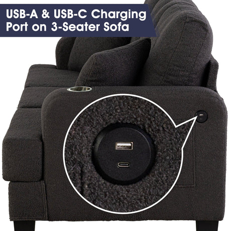 Dark Gray 3-Piece Sofa Set with Storage Ottoman & USB Charging