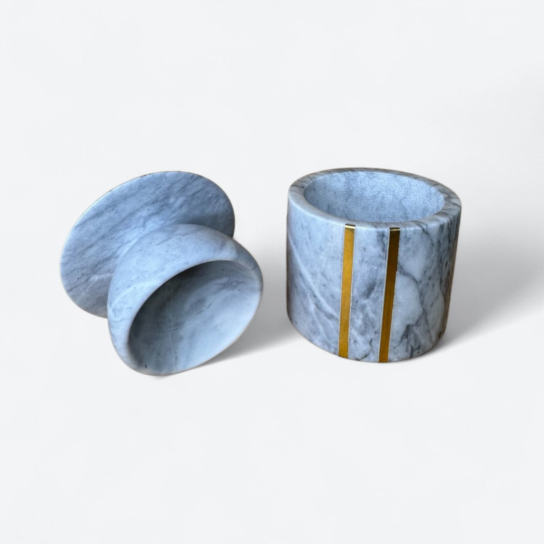 Introducing the Seraphina Marble Butter Jar, 4"D x 4.5"H, a masterpiece of elegance that seamlessly blends classic sophistication with modern design. Hand-carved solid marble, with a defining feature in its two vertical brass stripes. These radiant accents add a bold yet refined touch, contrasting beautifully with the cool marble finish.